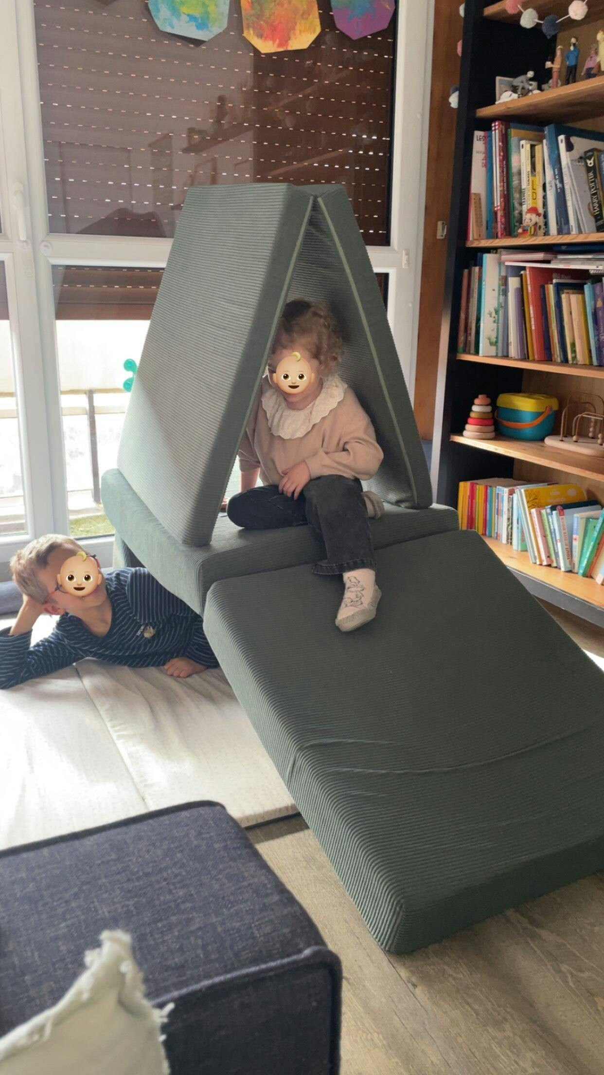 Mon fils de 3 ans l'a adopté dès qu'on la reçu, en cabane ou en matelas pour les soirées pyjama, en canapé pour lire... il est super beau et tout est pensé pour que ce super canapé de jeu qui a remplacé la table de lange et est devenue le meilleur meuble de la chambre des enfants! Mon fils l'a meme adopté pour dormir dedans.