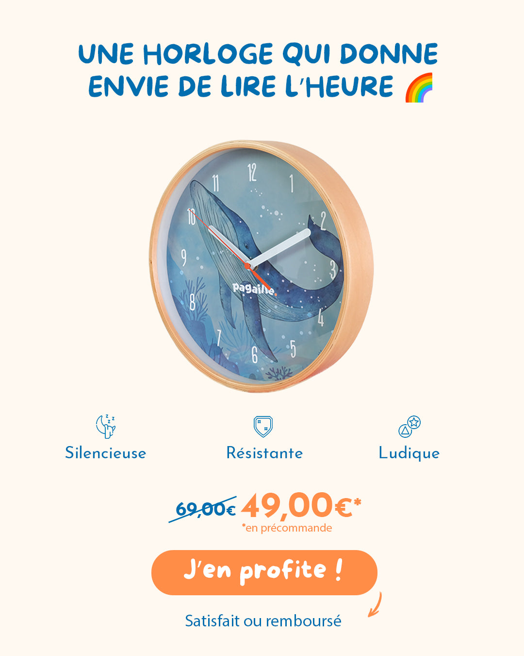 Notre horloge est accompagnée d’une horloge pédagogique en carton pour apprendre l’heure en manipulant, facilement et en s’amusant. 🎨